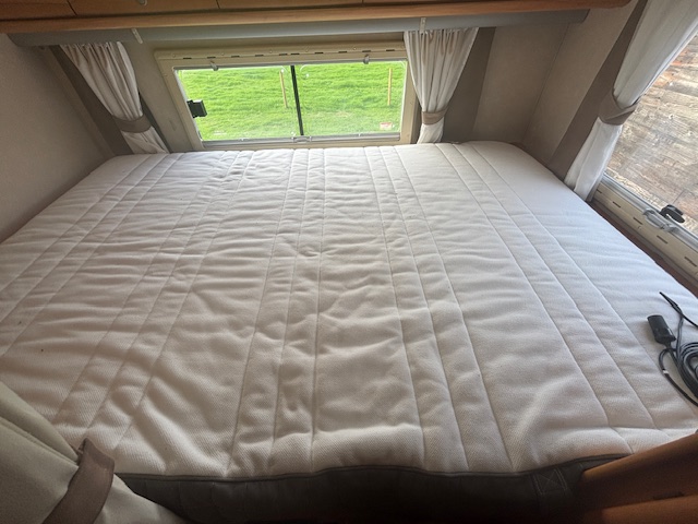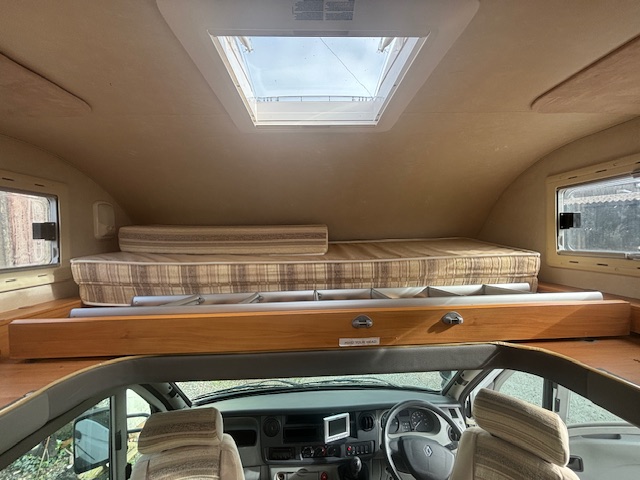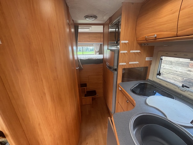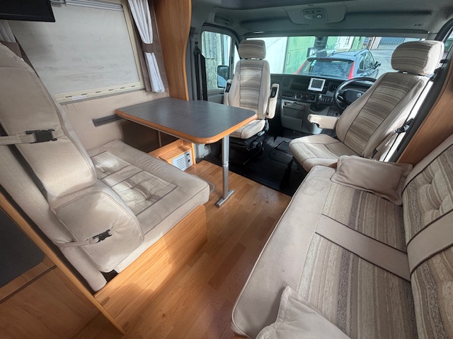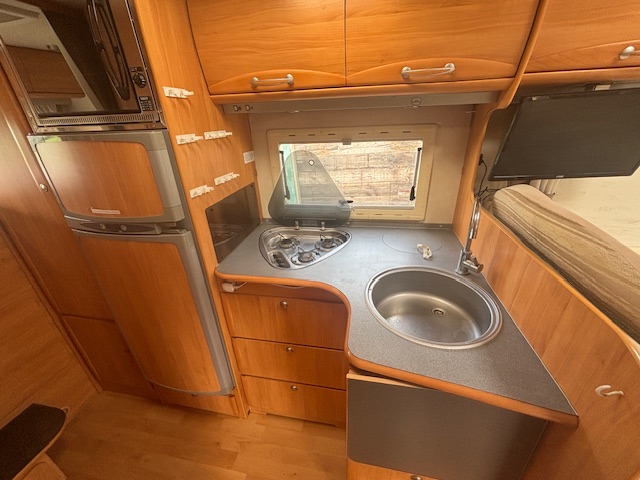 With a forward dinette lounge with two rear seatbelts that make a double bed and a further large overcab double bed , this lovely and bright Motorhome has also a rear double bed above a large garage space. The kitchen is located in the centre and compromise of a three-burner hob, Oven, sink and Large fridge/freezer, the washroom is located opposite and heating and hot water is provided by a Truma Gas system